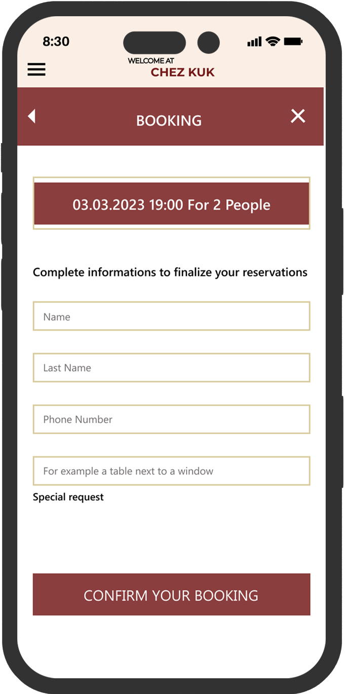 The usability study revealed that users wanted a special request section for events, food allergies, table position etc.. so i added that section in the last page of the booking process and change the button “SUBMIT” to “CONFIRM YOUR BOOKING”.